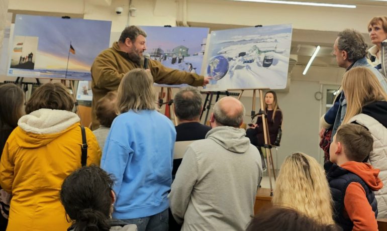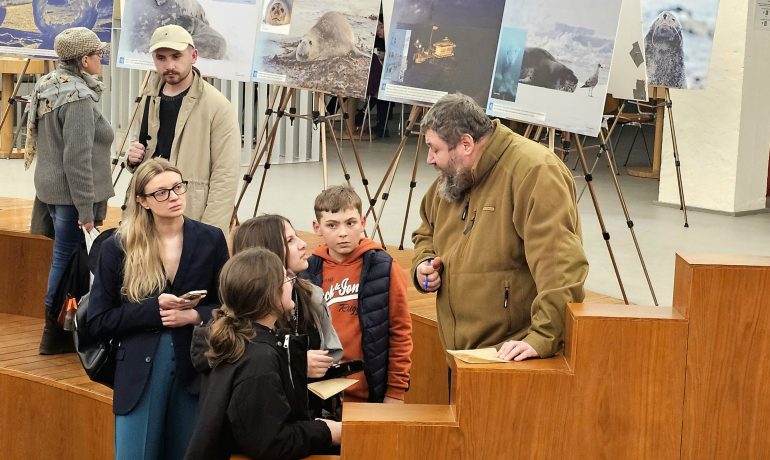 Далі директор Національного антарктичного наукового центру Євген Дикий провів для усіх присутніх екскурсію світлинами виставки. Зокрема, розказав, як 30 років тому від Великої Британії Україна отримала станцію, продовжила там геофізичні та метеорологічні дослідження, а також додала новий напрям — біологічний.