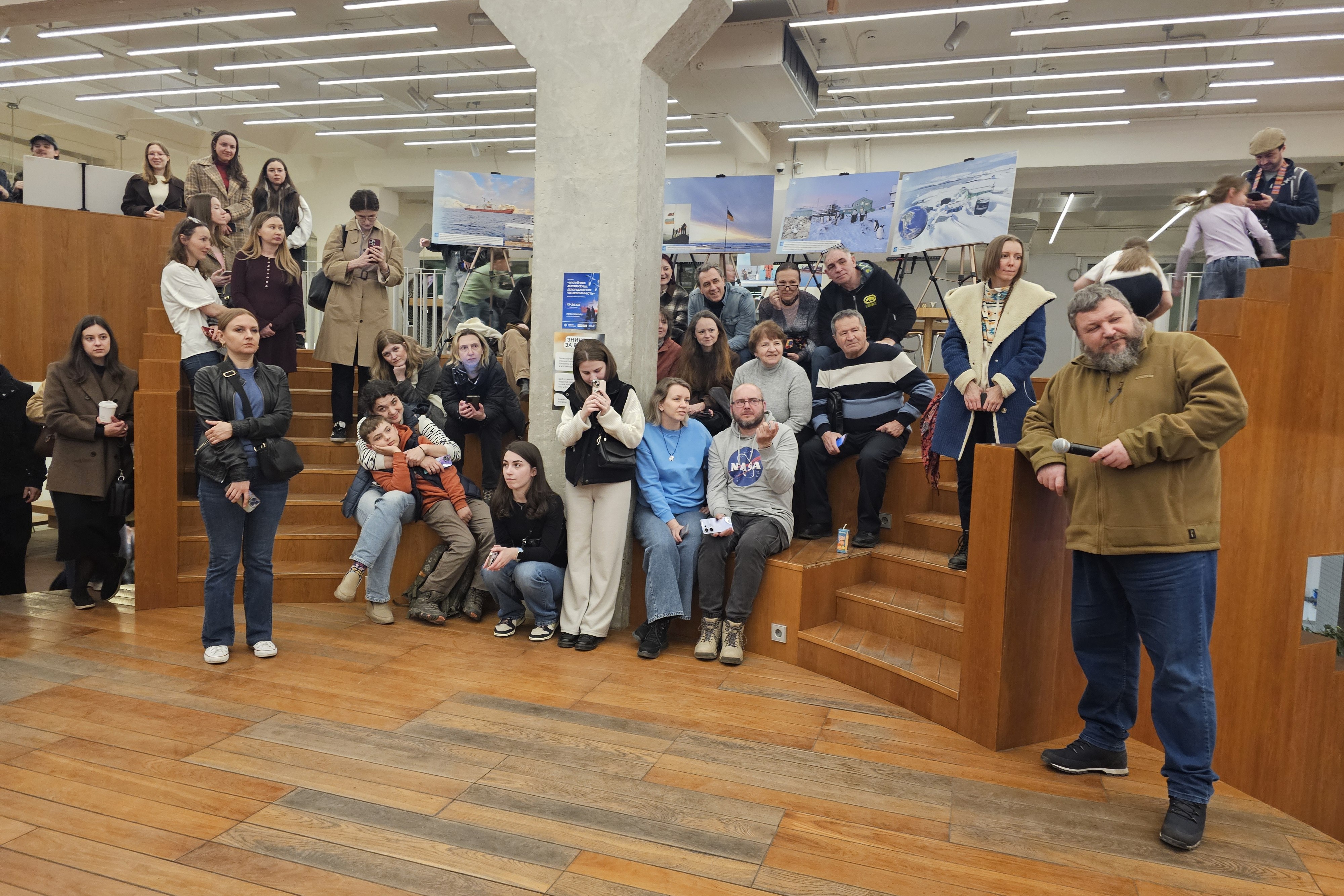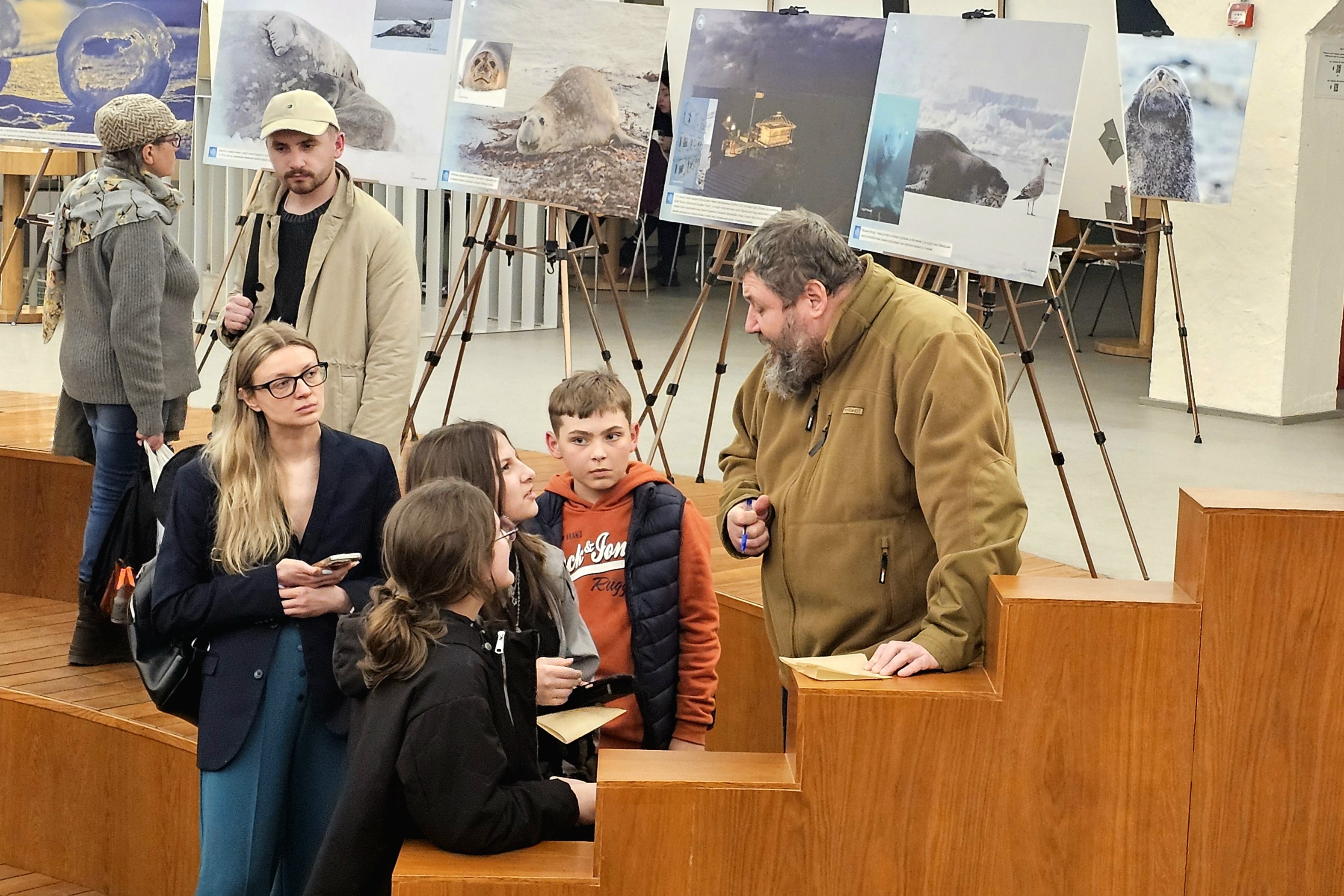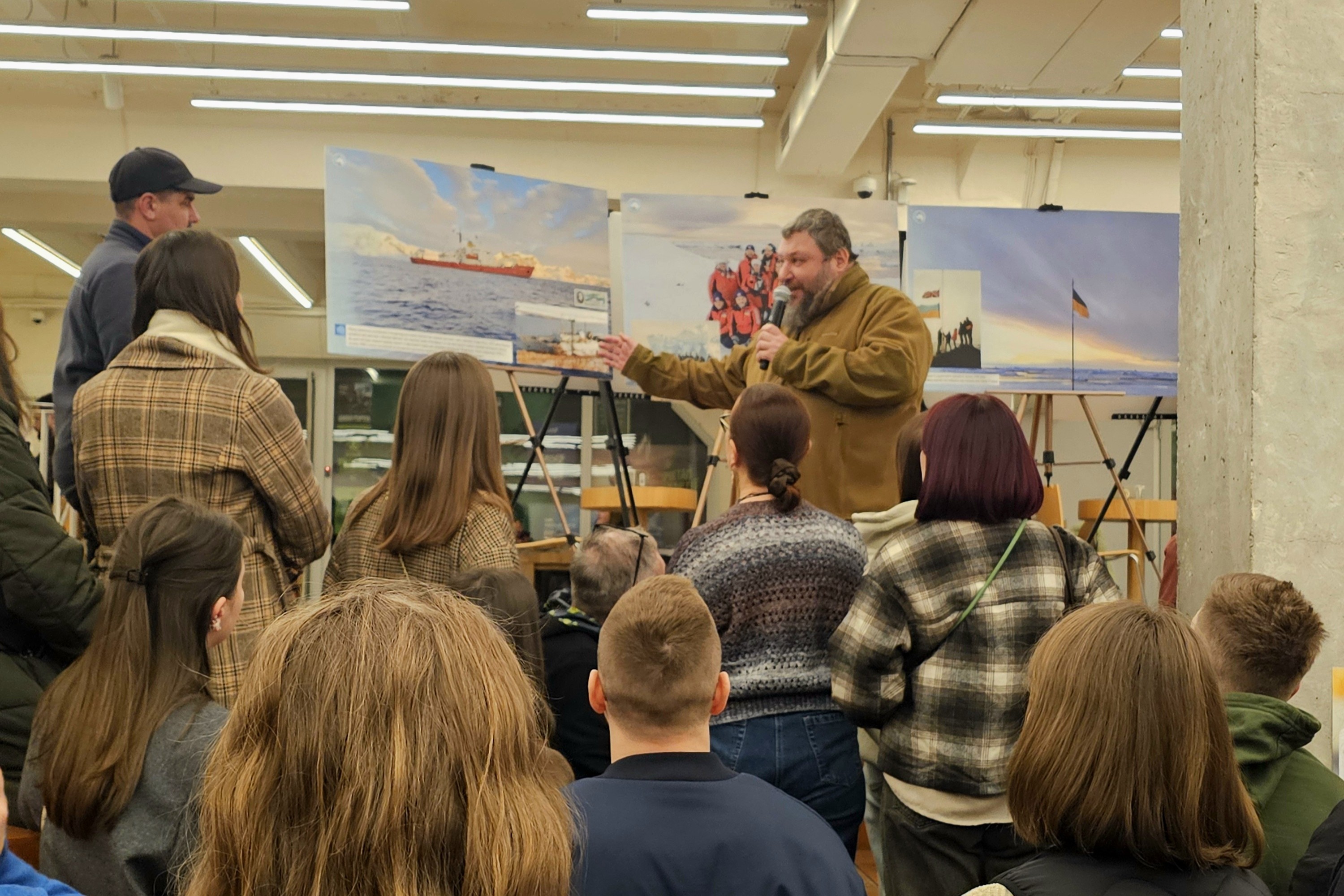 Далі директор Національного антарктичного наукового центру Євген Дикий провів для усіх присутніх екскурсію світлинами виставки. Зокрема, розказав, як 30 років тому від Великої Британії Україна отримала станцію, продовжила там геофізичні та метеорологічні дослідження, а також додала новий напрям — біологічний.