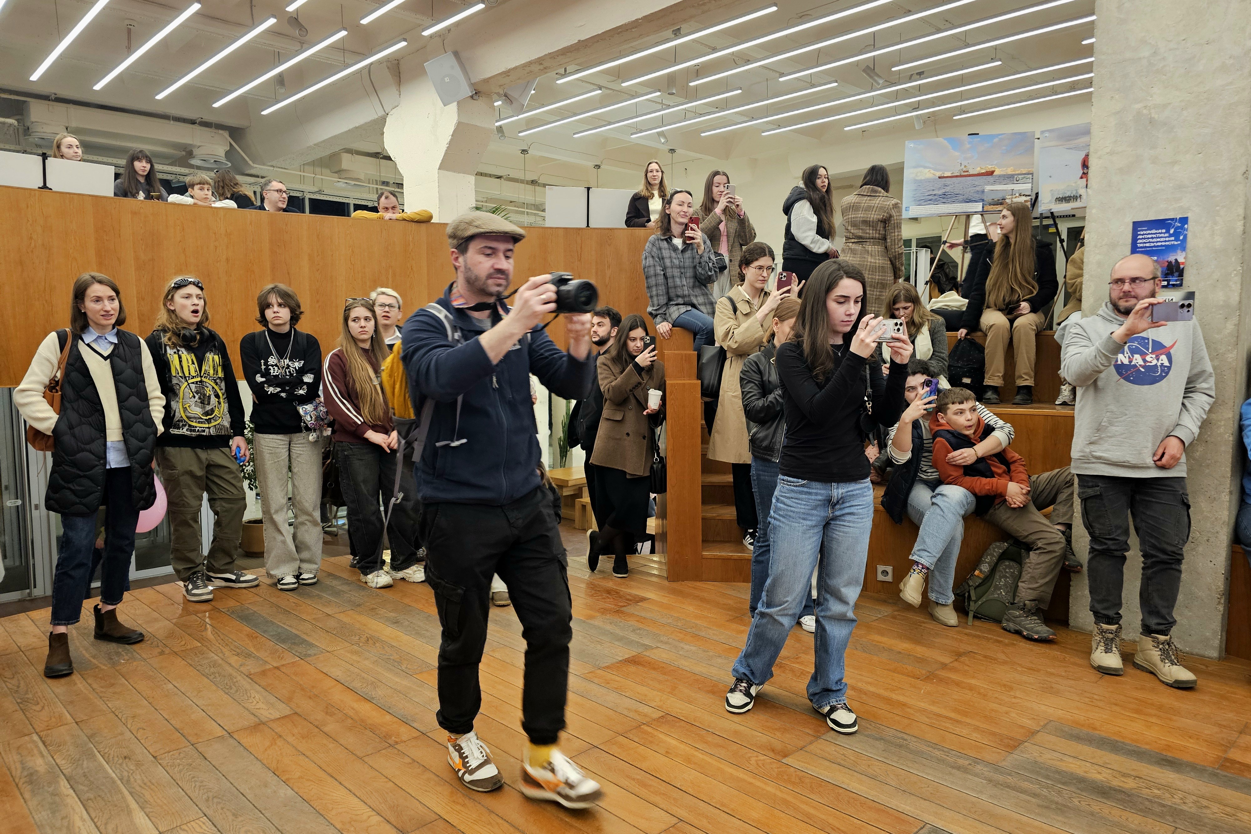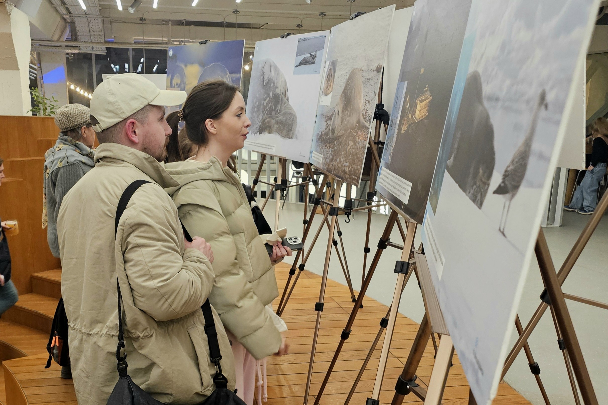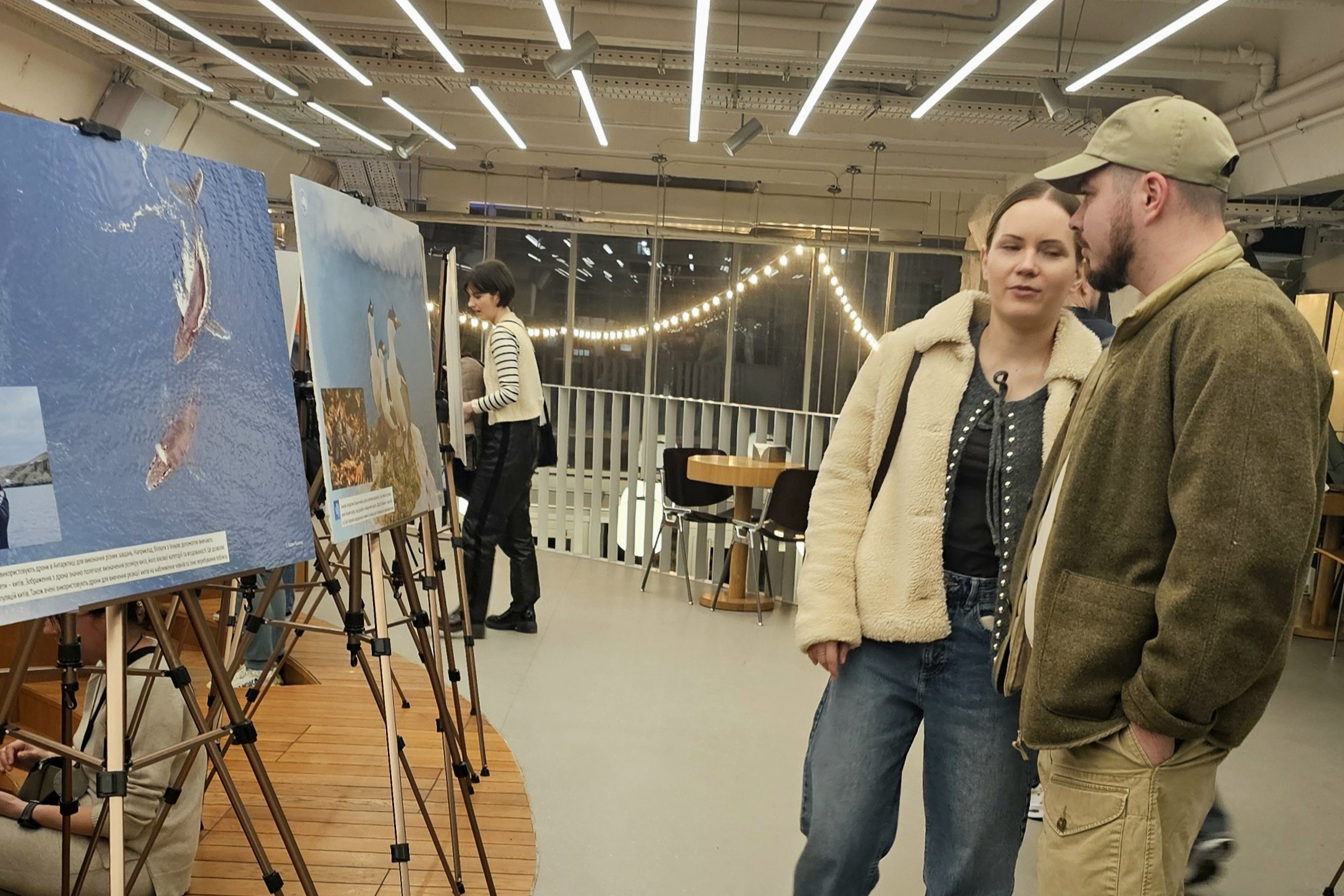 Далі директор Національного антарктичного наукового центру Євген Дикий провів для усіх присутніх екскурсію світлинами виставки. Зокрема, розказав, як 30 років тому від Великої Британії Україна отримала станцію, продовжила там геофізичні та метеорологічні дослідження, а також додала новий напрям — біологічний.
