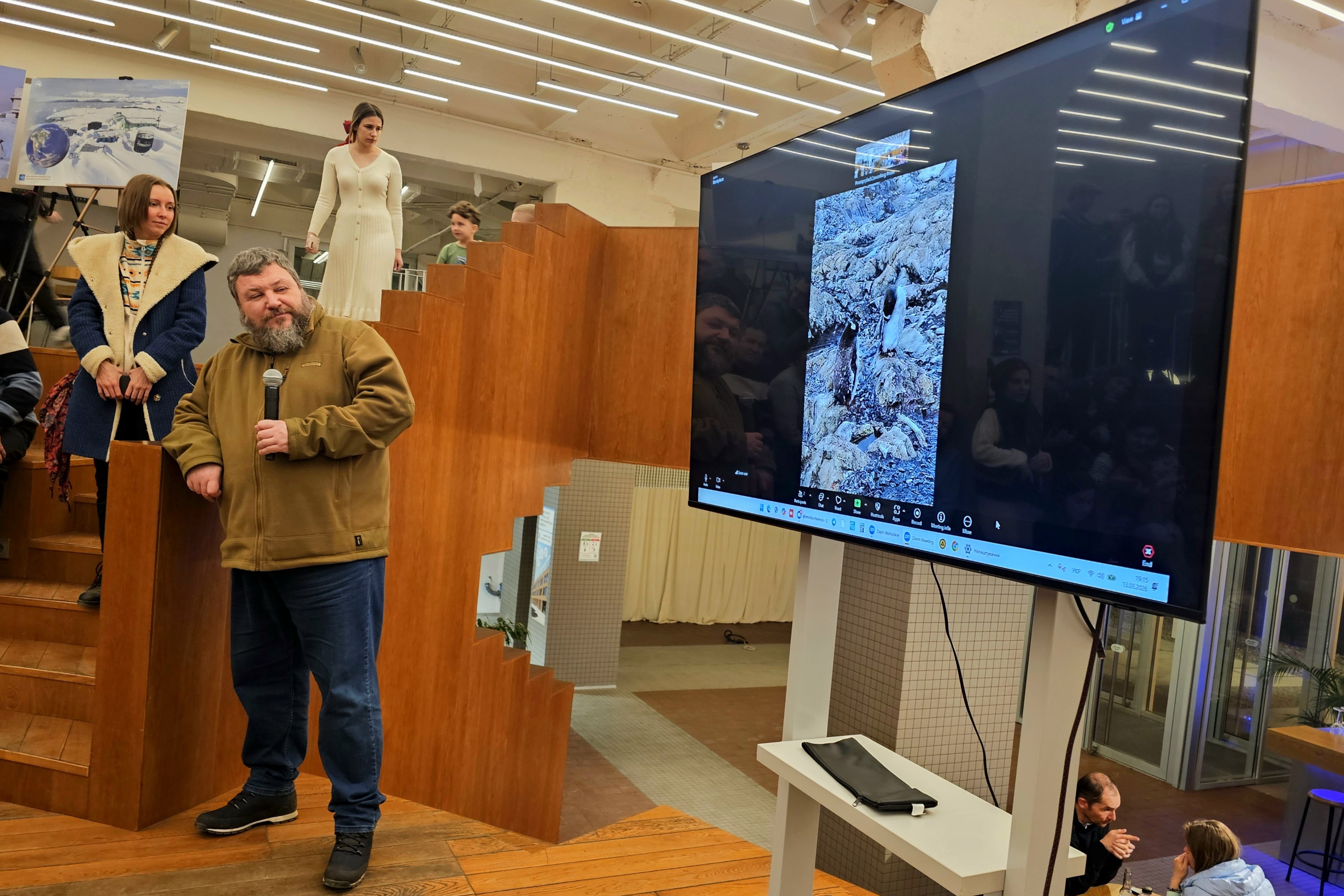 Він розказав про перезмінку команд, яка зараз відбувається, та зробив учасникам живе «вікно» в Антарктику. Приміром, показав, як мало снігу і криги лишилося навколо станції наприкінці антарктичного літа.