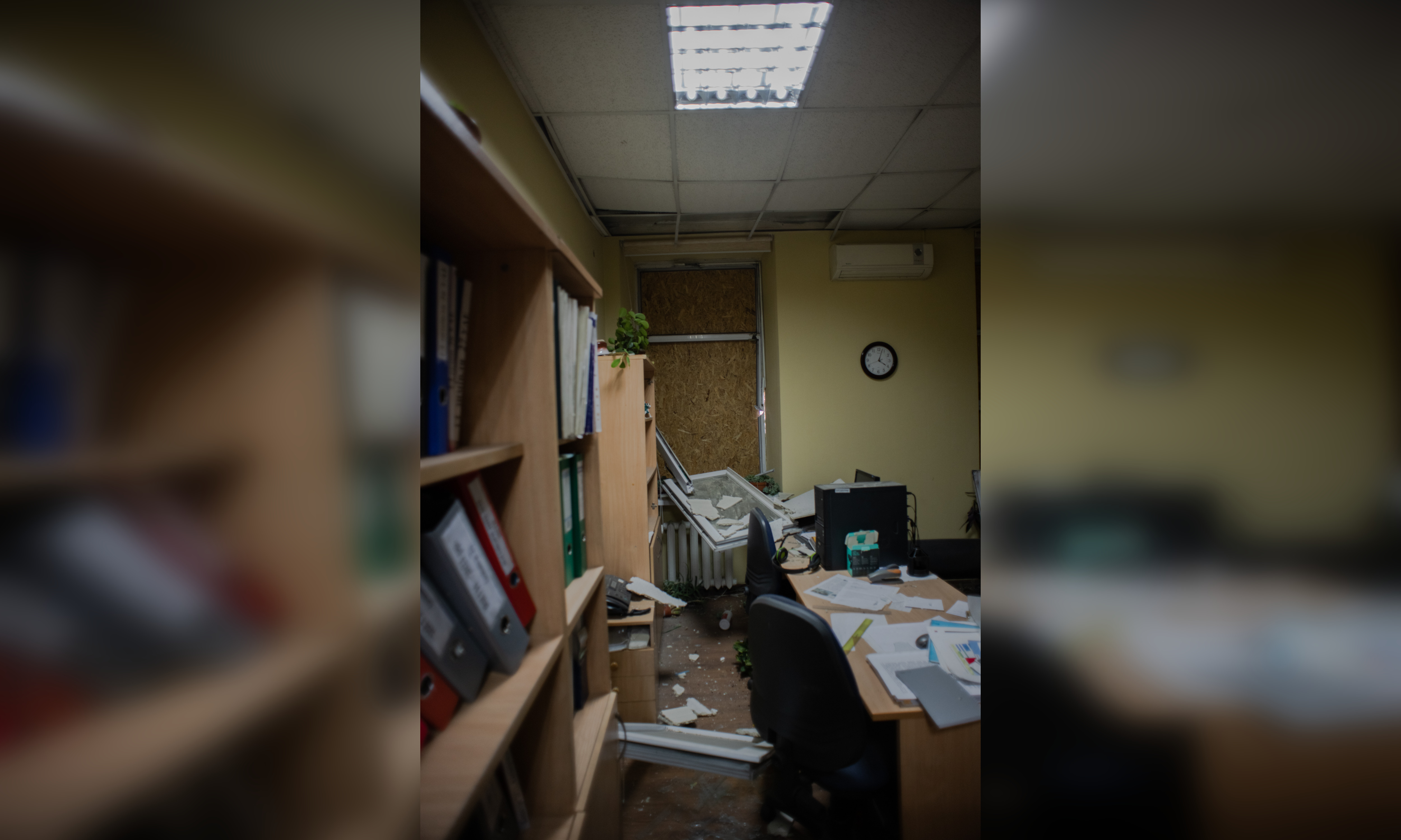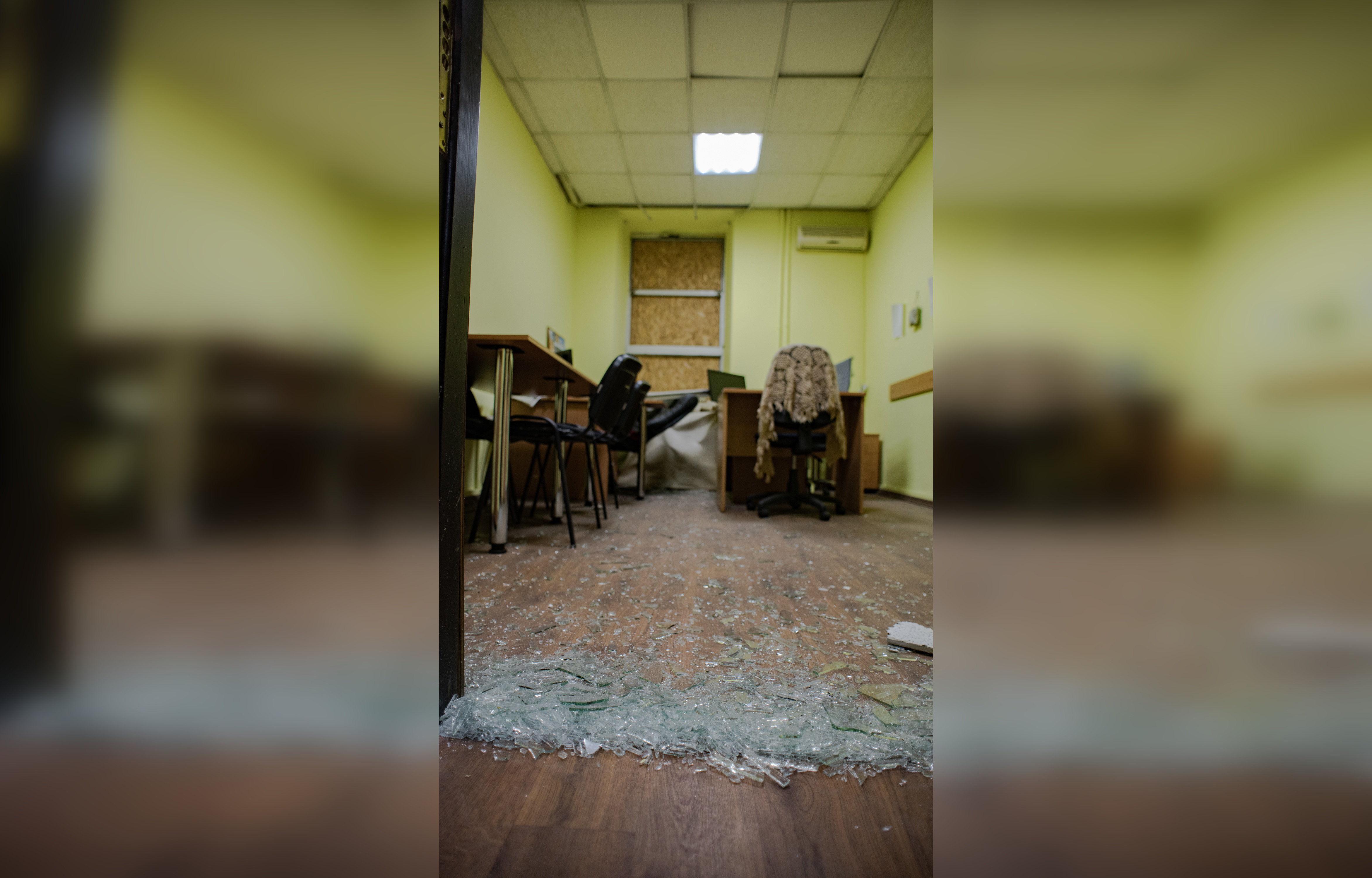 Recently there was an opportunity to enter the office. The hit wave broke all windows and glass. The strike was so strong that pieces of the broken glass as daggers got stuck into wooded doors. Inner concrete walls got cracks.