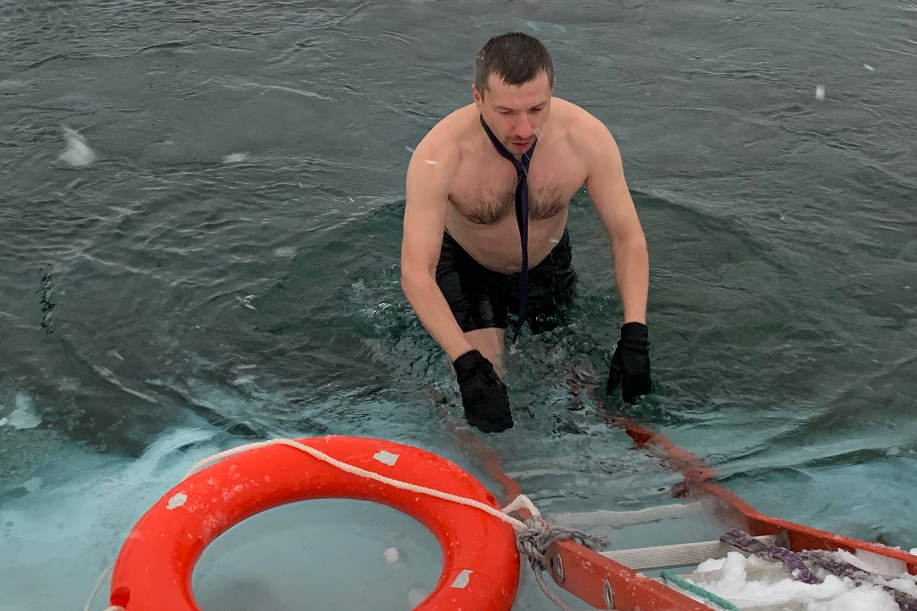 Відтак почалися приготування до занурення в океан — це своєрідна посвята в полярники. 30-й УАЕ не пощастило з погодою: був шторм, сніг, сильний вітер. Океан навколо нашого острова запакувало кригою, тож довелося шукати шматочок вільної води.