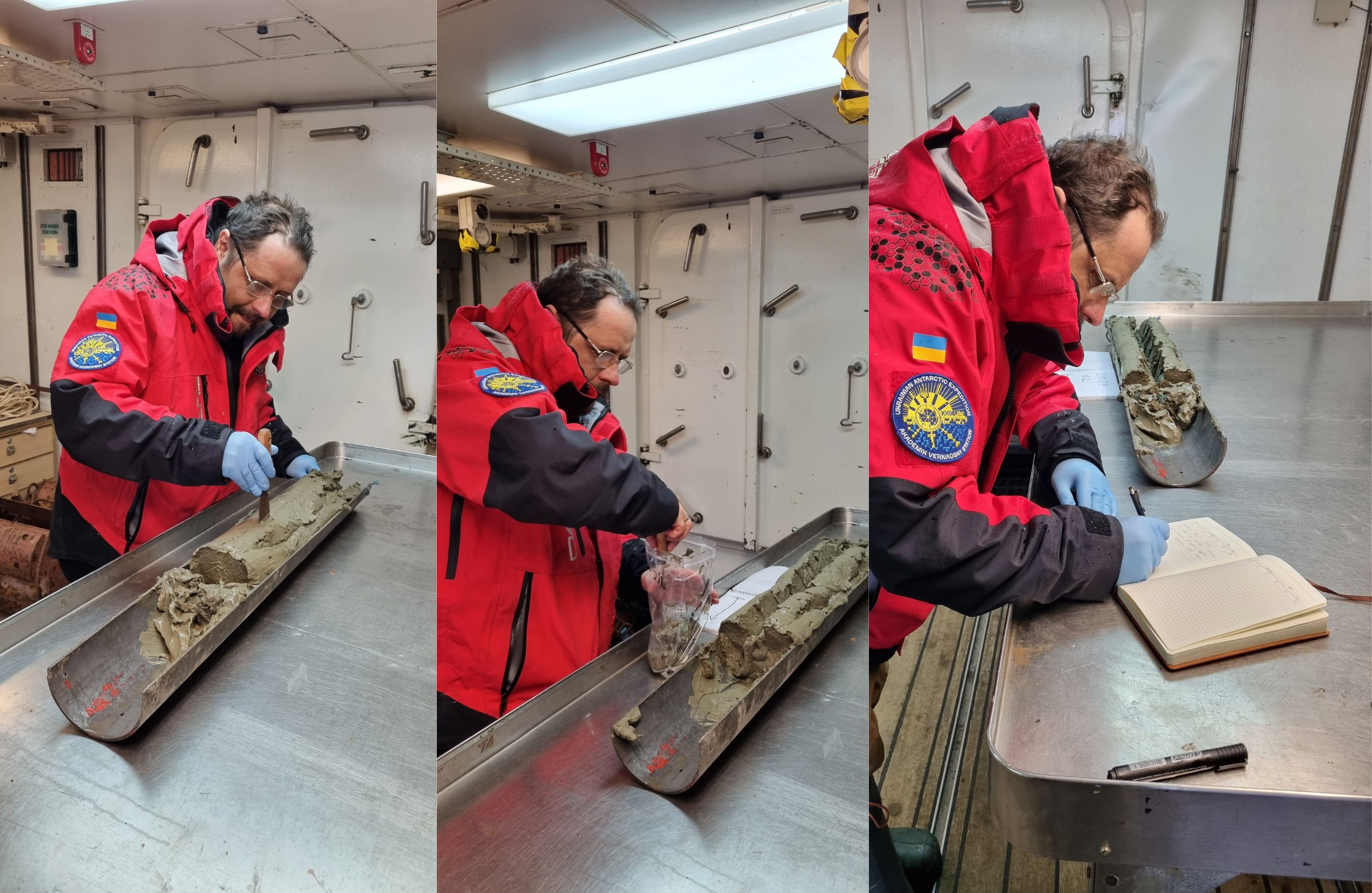 Науковцям вдалося взяти 7 колонок донних відкладів у 7 точках неподалік нашої станції (протоки Пенола та Френч, де виявлені тектонічний розлом та льодовикові долини). На борту підняті зразки докладно описали, сфотографували та розділили на частини для доправки в Україну. Далі їх вивчатимуть в лабораторіях Києва та Одеси.