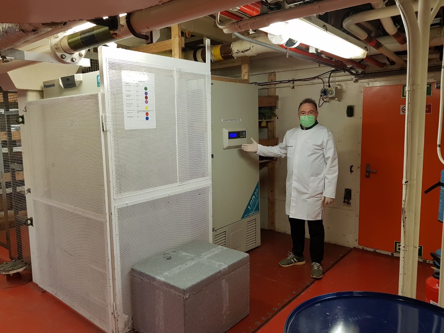 Щоб забезпечити дотримання всіх норм холодового ланцюгу, на криголамі вакцини зберігаються у відповідній морозильній камері. Вона працює в режимі -78 градусів за Цельсієм. За нормами зберігання вакцин стежить лікар “Ноосфери” Сергій Носенко.