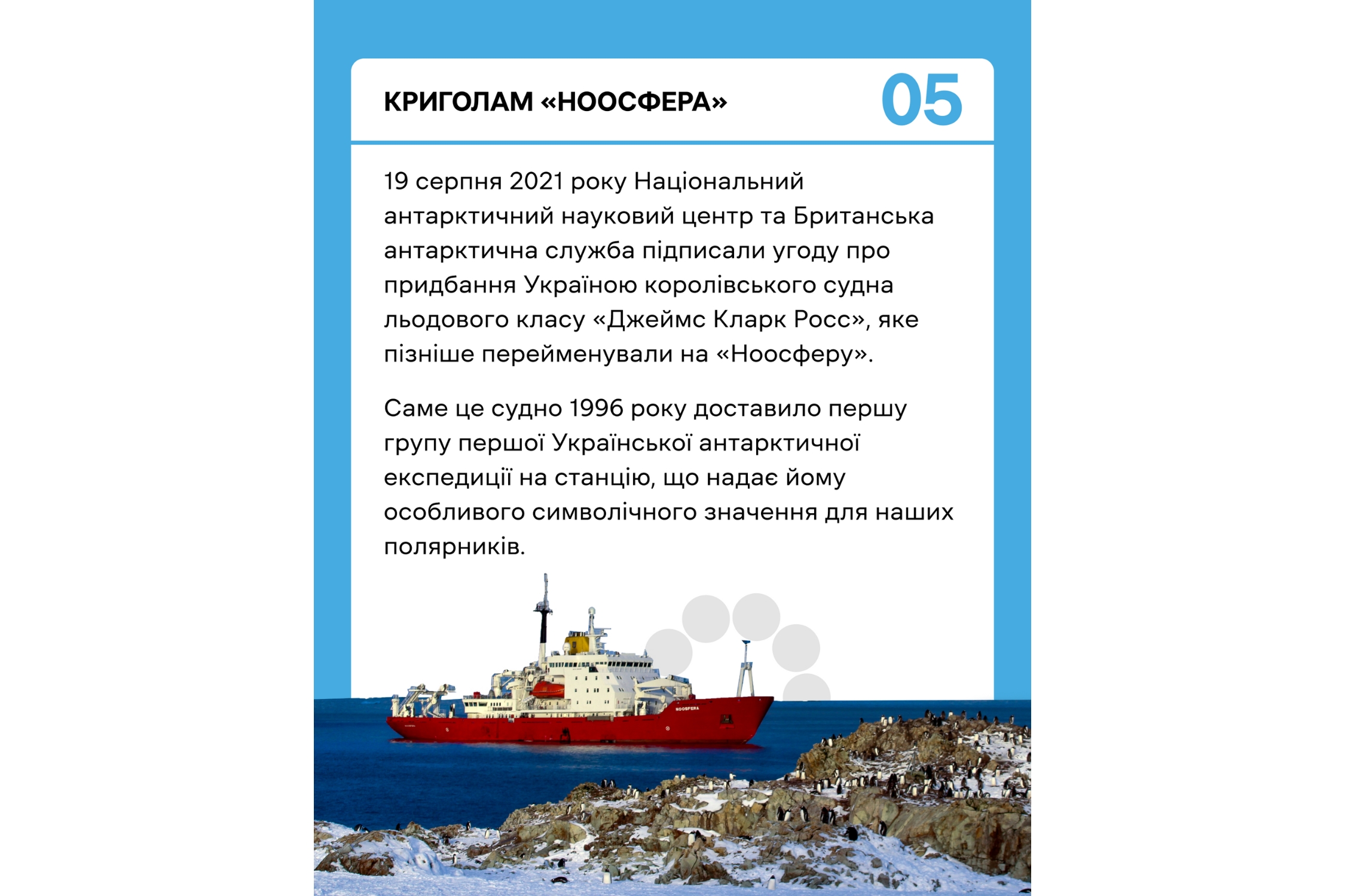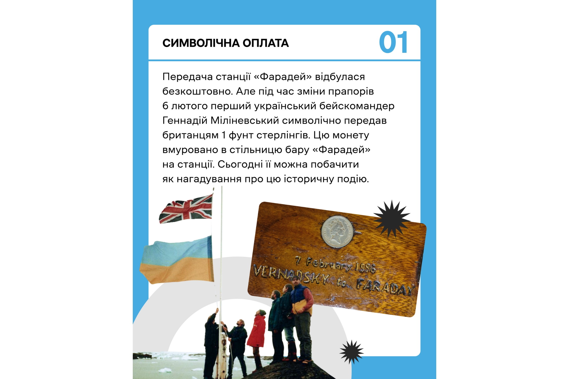 6 лютого 1996 року в історії української науки відкрилася нова сторінка. Велика Британія передала Україні станцію «Фарадей», що стала нашою першою і поки що єдиною антарктичною базою.