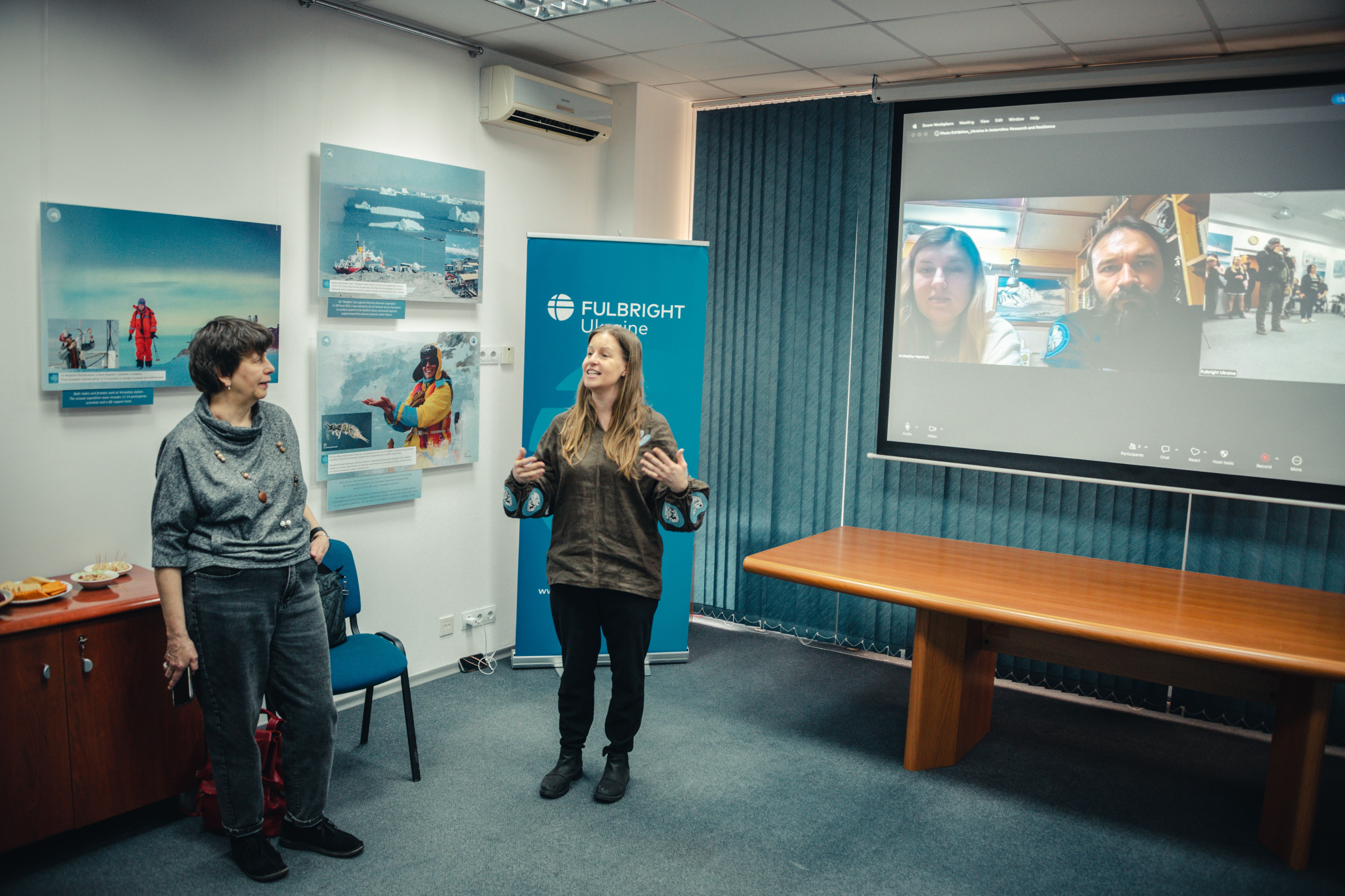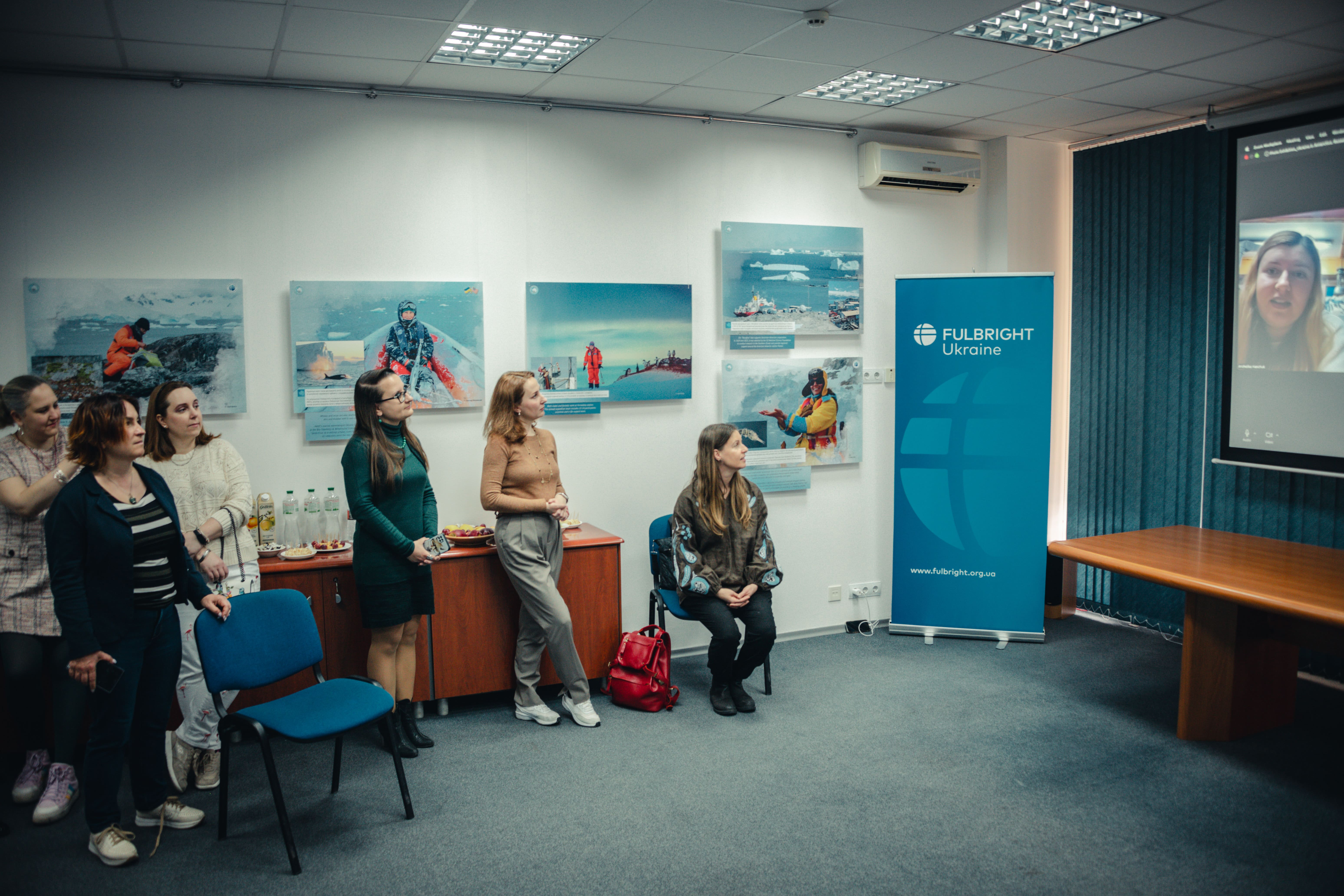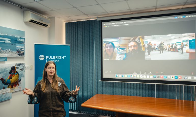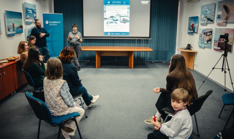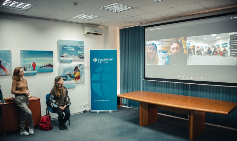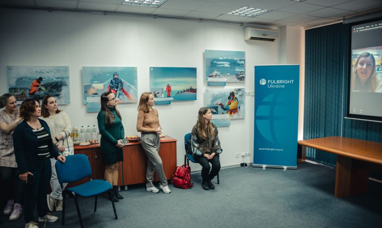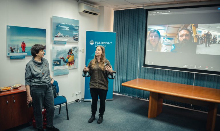 Під час відкриття гостей фулбрайтівського офісу привітала Джессіка Зихович, директорка Програми імені Фулбрайта і Представництва Інституту міжнародної освіти в Україні. Заступниця директора НАНЦ з наукової роботи Ірина Козерецька поділилася власним досвідом учасниці антарктичних експедицій, розповіла про роботу Центру, а також провела екскурсію світлинами.