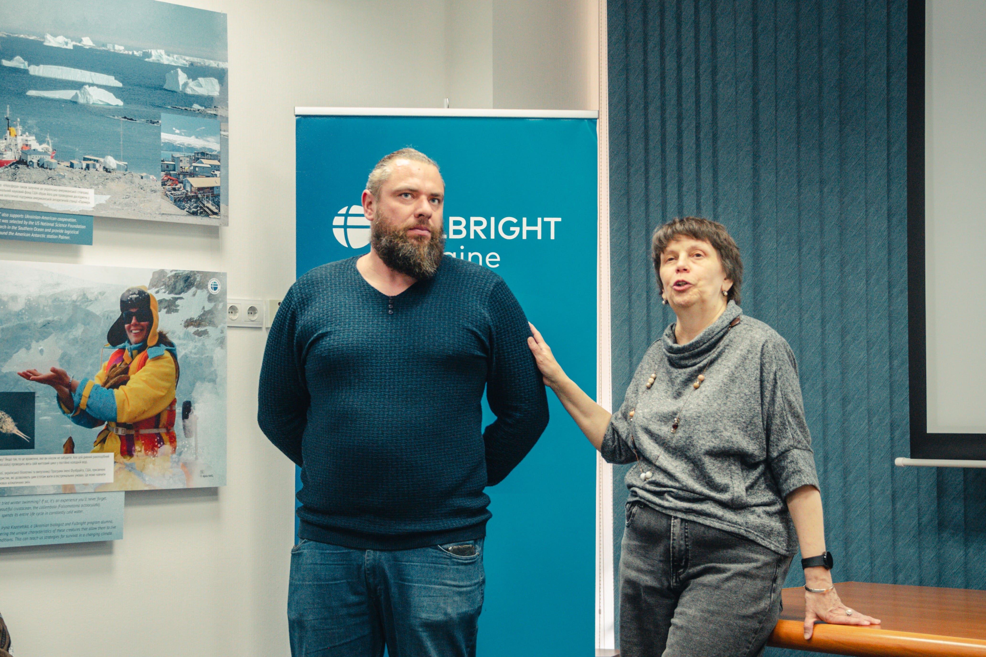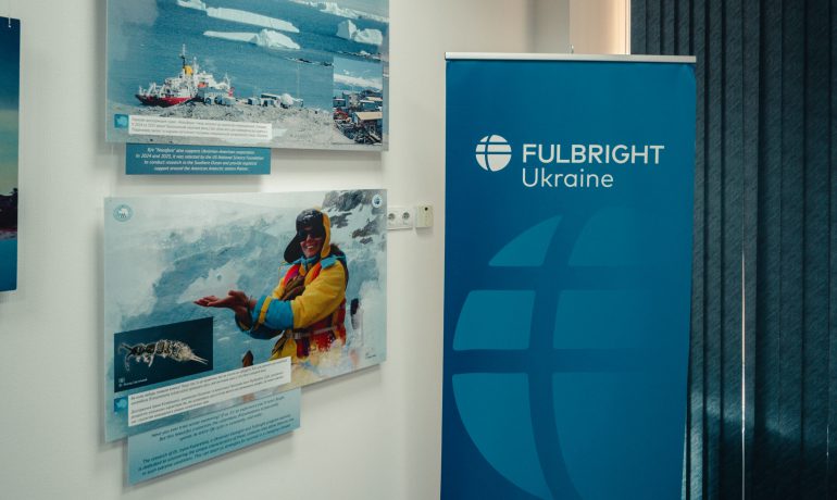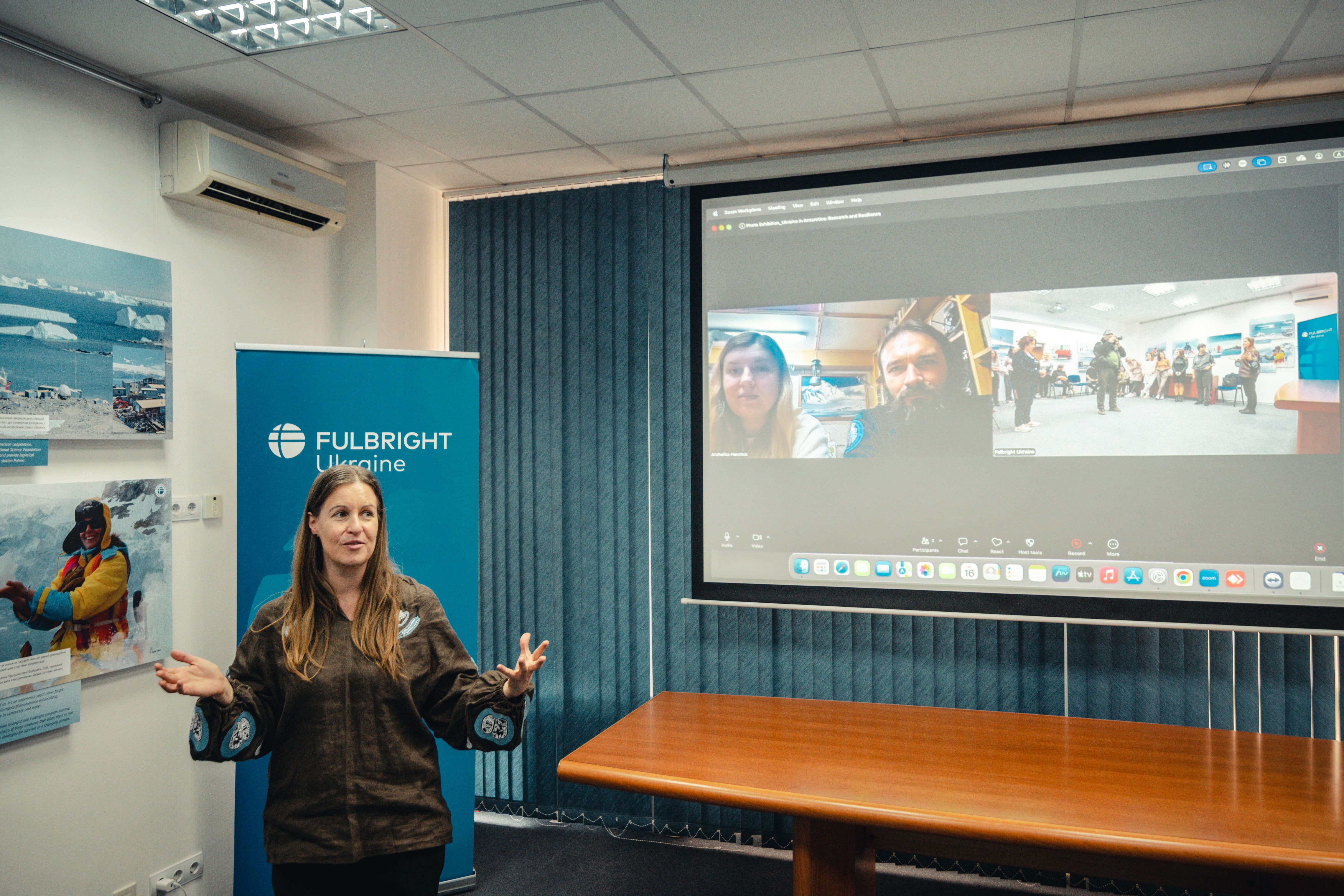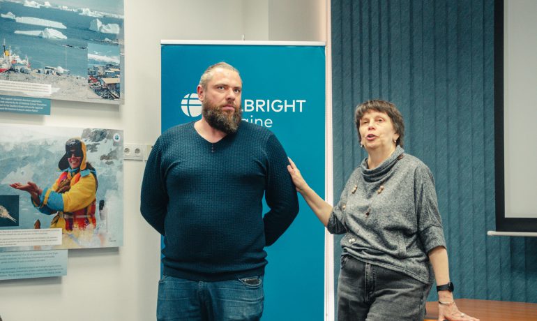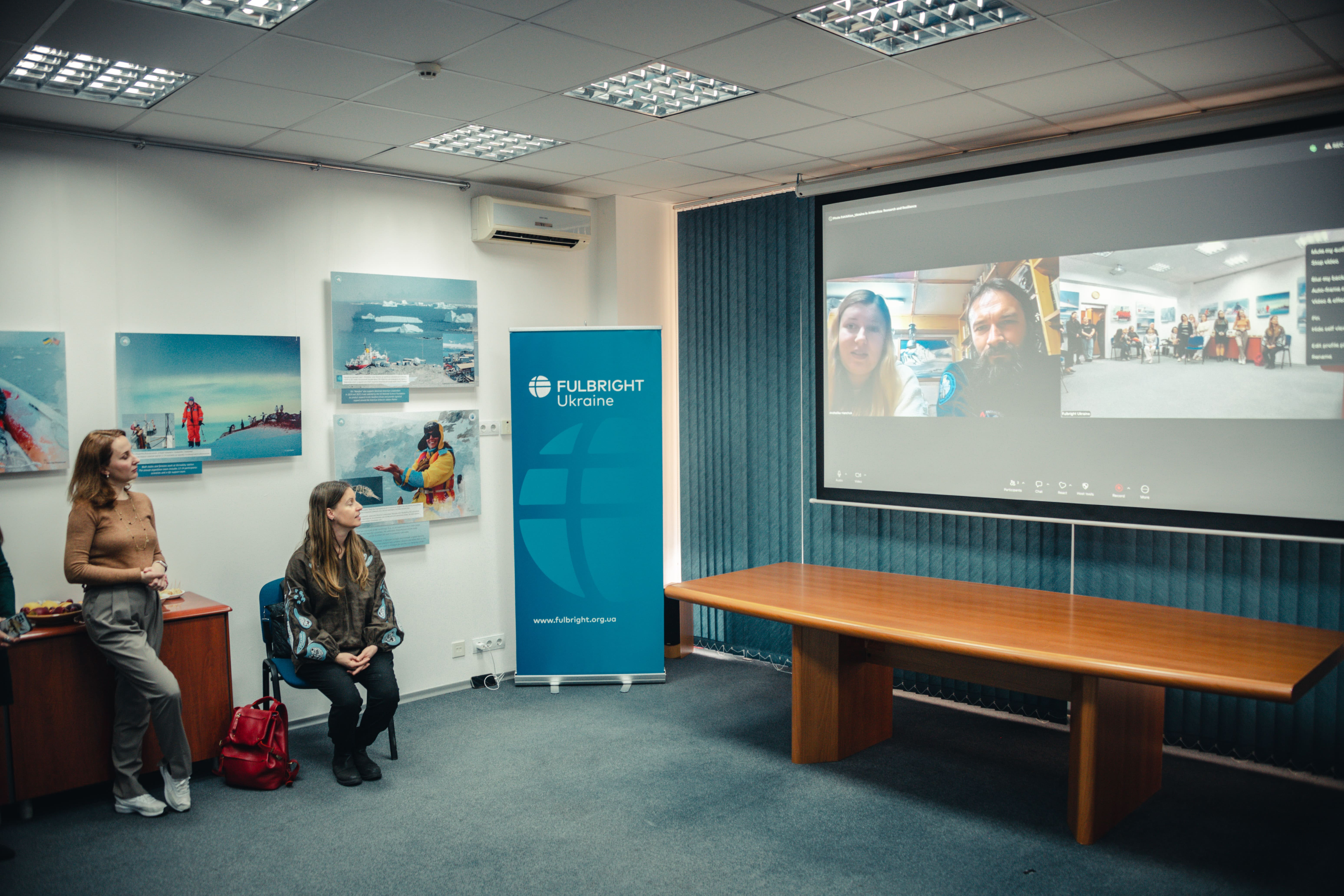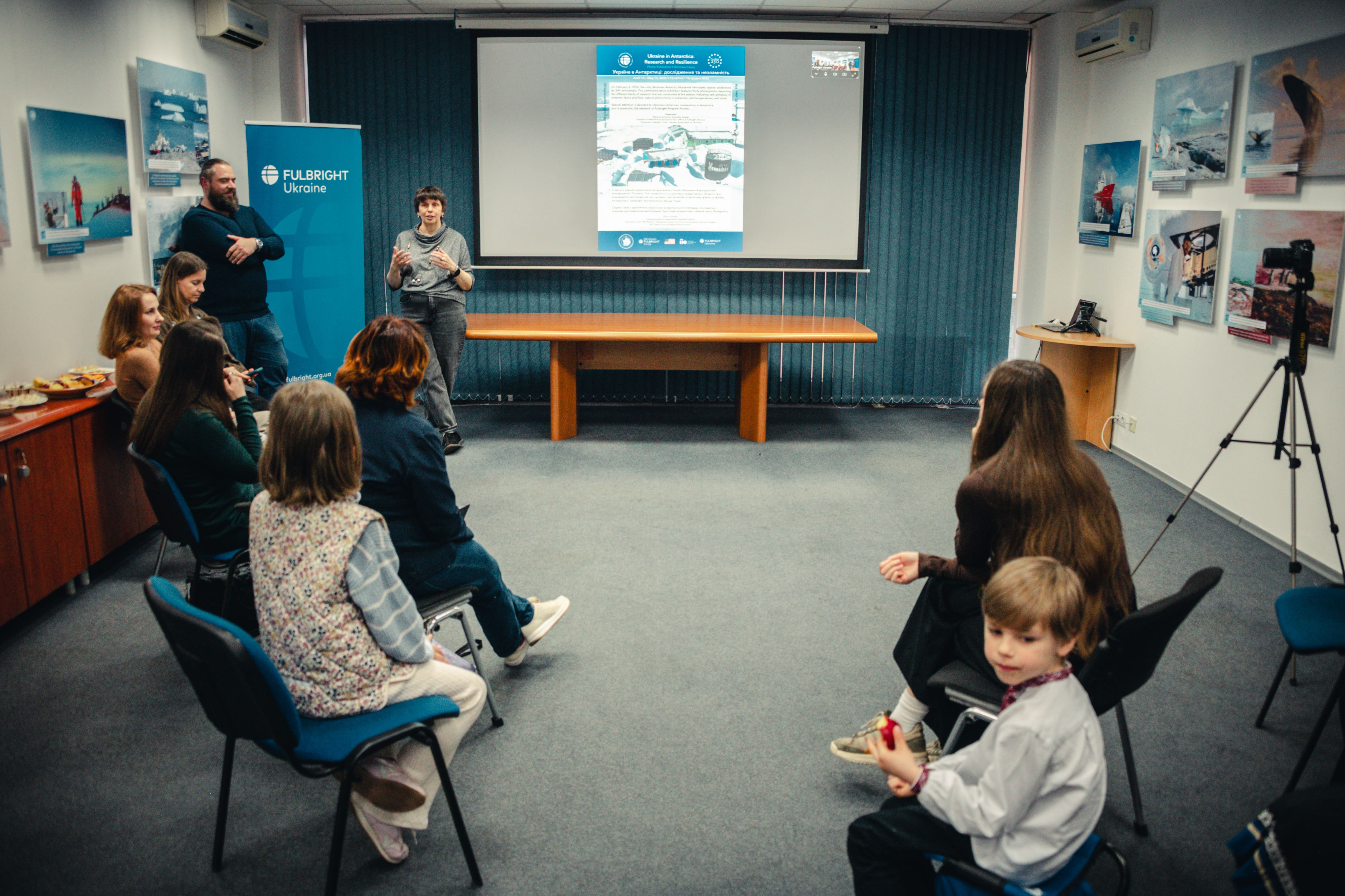 Під час відкриття гостей фулбрайтівського офісу привітала Джессіка Зихович, директорка Програми імені Фулбрайта і Представництва Інституту міжнародної освіти в Україні. Заступниця директора НАНЦ з наукової роботи Ірина Козерецька поділилася власним досвідом учасниці антарктичних експедицій, розповіла про роботу Центру, а також провела екскурсію світлинами.