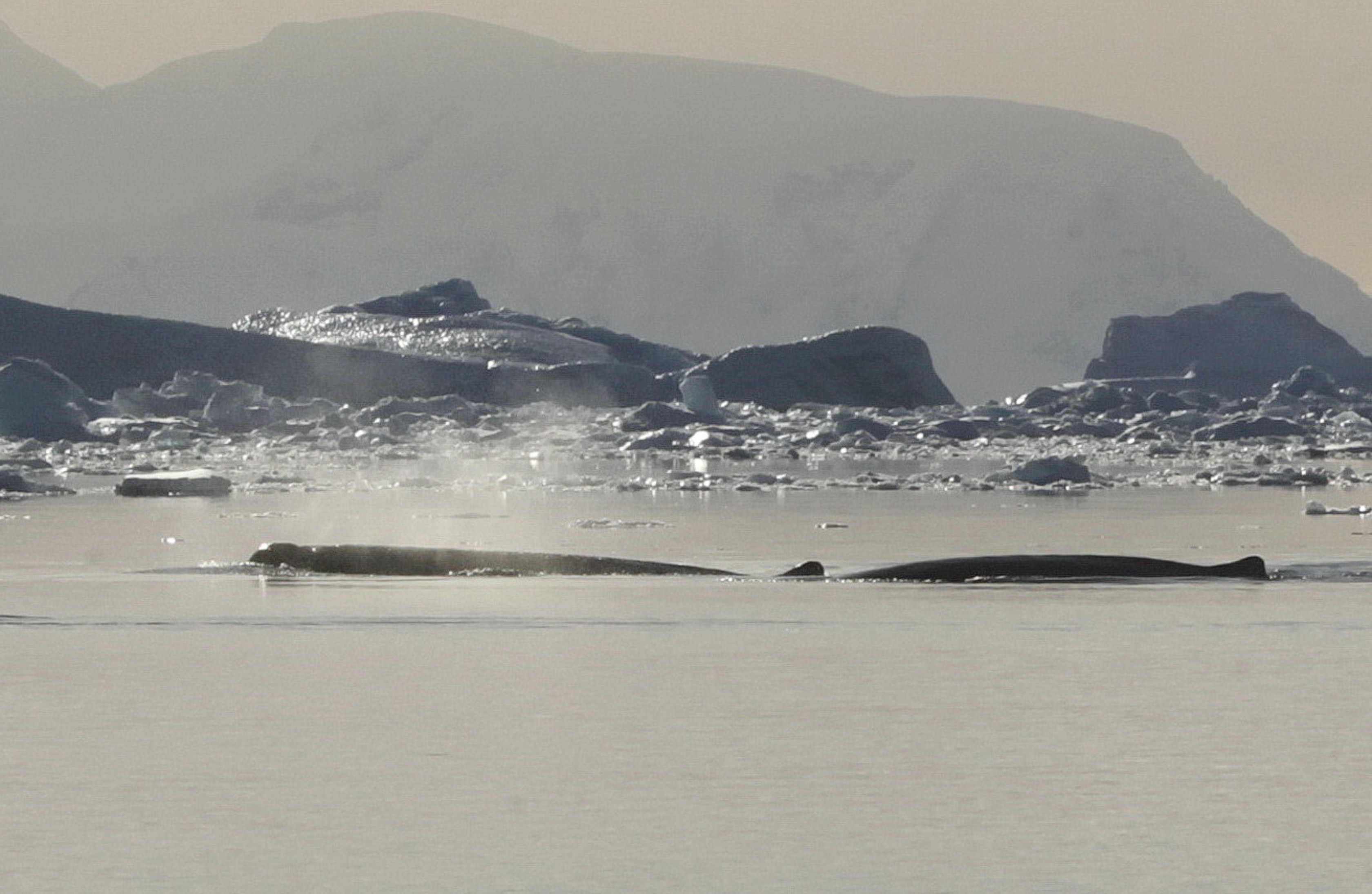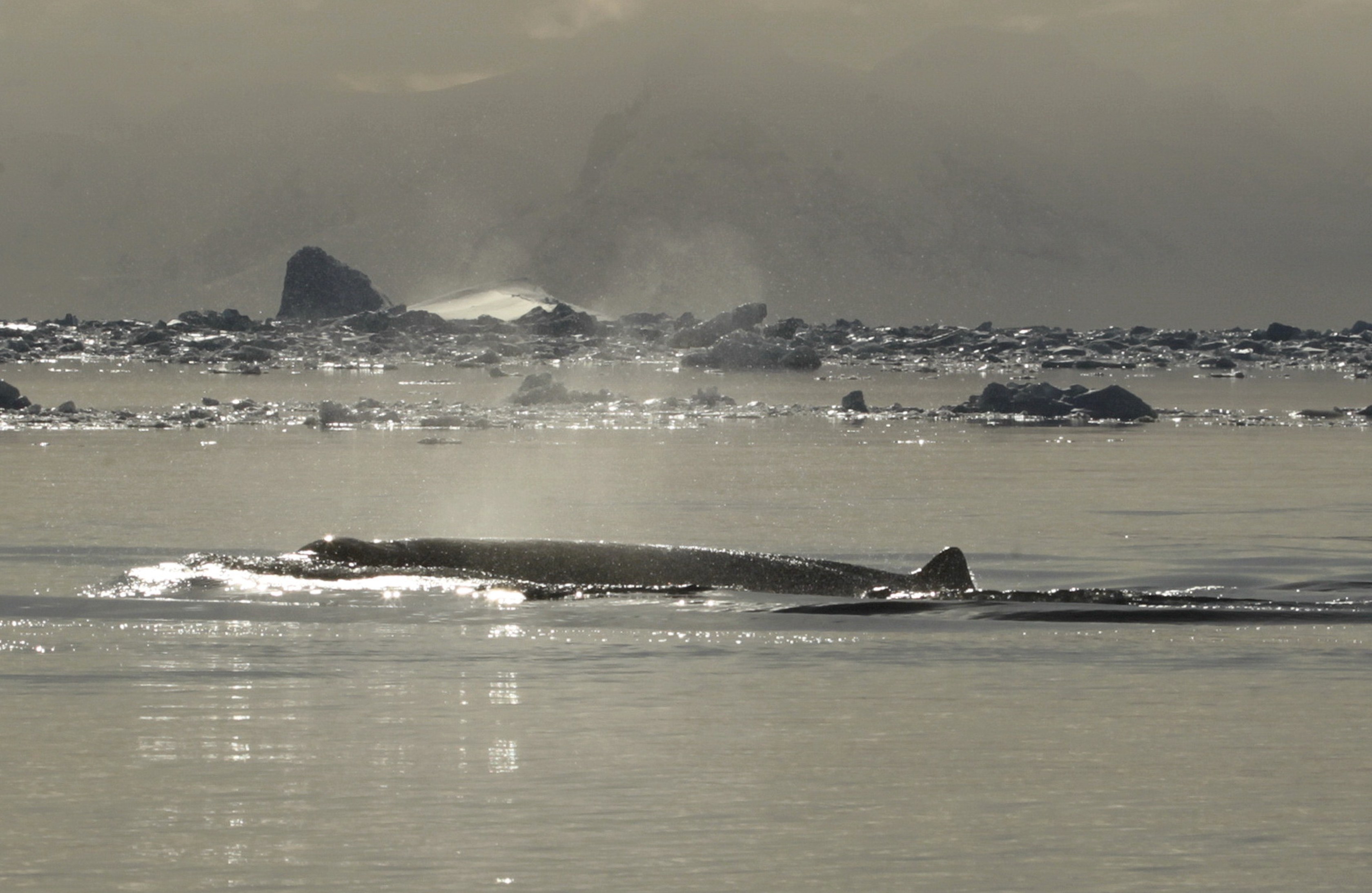 У перший же день роботи команді човна надзвичайно пощастило – вони помітили групу з 5 південних плавунів. Зустріч тривала кілька секунд, але біологи встигли зробити фото китів та передали інформацію про напрямок їхнього руху на “Ноосферу”. Завдяки цьому з судна вдалося записати звуки плавунів.